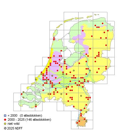 Het aantal atlasblokken (5x5 km) waarin de soort is gemeld binnen een periode van vijf jaar (vanaf 1980) of twintig jaar. Niet gecorrigeerd voor waarnemersinspanning en het aantal doorgegeven waarnemingen kan sterk variëren per periode, dus een trend in verspreiding kan hier niet direct uit worden afgelezen. Het opgegeven jaartal is het eerste jaar van de periode. Bron: gevalideerde waarnemingen uit de NDFF.