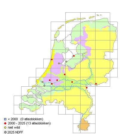 Het aantal atlasblokken (5x5 km) waarin de soort is gemeld binnen een periode van vijf jaar (vanaf 1980) of twintig jaar. Niet gecorrigeerd voor waarnemersinspanning en het aantal doorgegeven waarnemingen kan sterk variëren per periode, dus een trend in verspreiding kan hier niet direct uit worden afgelezen. Het opgegeven jaartal is het eerste jaar van de periode. Bron: gevalideerde waarnemingen uit de NDFF.
