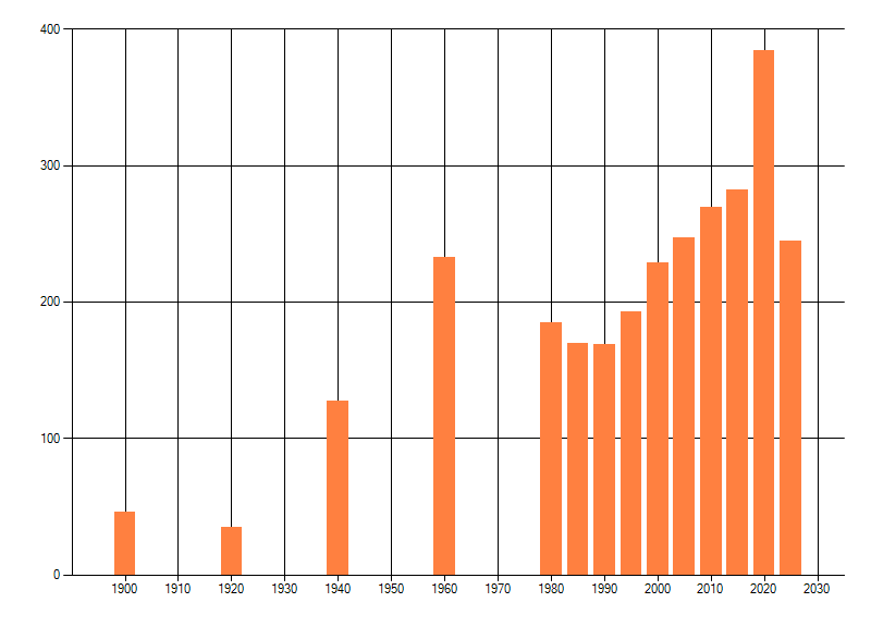 Het aantal atlasblokken (5x5 km) waarin de soort is gemeld binnen een periode van vijf jaar (vanaf 1980) of twintig jaar. Niet gecorrigeerd voor waarnemersinspanning en het aantal doorgegeven waarnemingen kan sterk variëren per periode, dus een trend in verspreiding kan hier niet direct uit worden afgelezen. Het opgegeven jaartal is het eerste jaar van de periode. Bron: gevalideerde waarnemingen uit de NDFF.