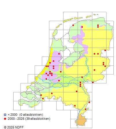 Het aantal atlasblokken (5x5 km) waarin de soort is gemeld binnen een periode van vijf jaar (vanaf 1980) of twintig jaar. Niet gecorrigeerd voor waarnemersinspanning en het aantal doorgegeven waarnemingen kan sterk variëren per periode, dus een trend in verspreiding kan hier niet direct uit worden afgelezen. Het opgegeven jaartal is het eerste jaar van de periode. Bron: gevalideerde waarnemingen uit de NDFF.