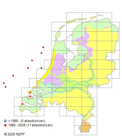 Het aantal atlasblokken (5x5 km) waarin de soort is gemeld binnen een periode van vijf jaar (vanaf 1980) of twintig jaar. Niet gecorrigeerd voor waarnemersinspanning en het aantal doorgegeven waarnemingen kan sterk variëren per periode, dus een trend in verspreiding kan hier niet direct uit worden afgelezen. Het opgegeven jaartal is het eerste jaar van de periode. Bron: gevalideerde waarnemingen uit de NDFF.