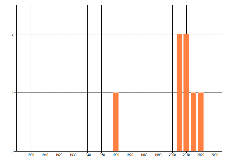 Het aantal atlasblokken (5x5 km) waarin de soort is gemeld binnen een periode van vijf jaar (vanaf 1980) of twintig jaar. Niet gecorrigeerd voor waarnemersinspanning en het aantal doorgegeven waarnemingen kan sterk variëren per periode, dus een trend in verspreiding kan hier niet direct uit worden afgelezen. Het opgegeven jaartal is het eerste jaar van de periode. Bron: gevalideerde waarnemingen uit de NDFF.