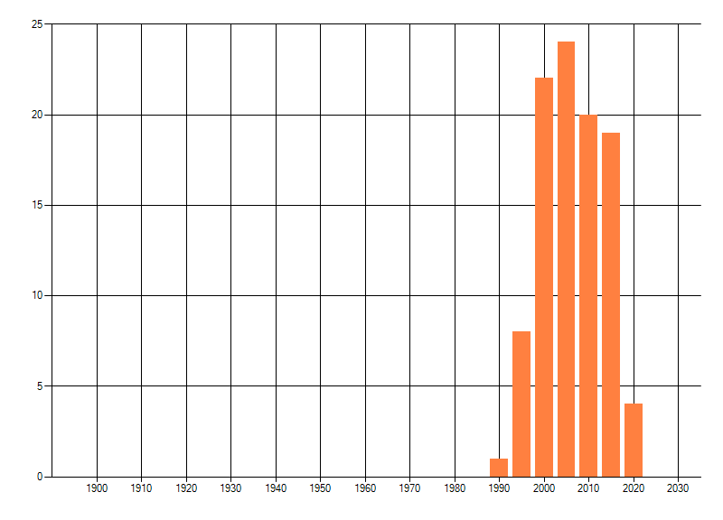 Het aantal atlasblokken (5x5 km) waarin de soort is gemeld binnen een periode van vijf jaar (vanaf 1980) of twintig jaar. Niet gecorrigeerd voor waarnemersinspanning en het aantal doorgegeven waarnemingen kan sterk variëren per periode, dus een trend in verspreiding kan hier niet direct uit worden afgelezen. Het opgegeven jaartal is het eerste jaar van de periode. Bron: gevalideerde waarnemingen uit de NDFF.