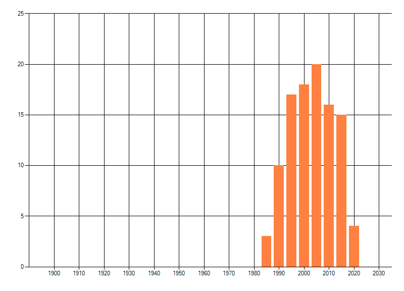 Het aantal atlasblokken (5x5 km) waarin de soort is gemeld binnen een periode van vijf jaar (vanaf 1980) of twintig jaar. Niet gecorrigeerd voor waarnemersinspanning en het aantal doorgegeven waarnemingen kan sterk variëren per periode, dus een trend in verspreiding kan hier niet direct uit worden afgelezen. Het opgegeven jaartal is het eerste jaar van de periode. Bron: gevalideerde waarnemingen uit de NDFF.