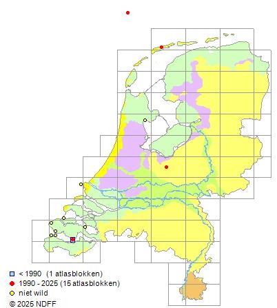 Het aantal atlasblokken (5x5 km) waarin de soort is gemeld binnen een periode van vijf jaar (vanaf 1980) of twintig jaar. Niet gecorrigeerd voor waarnemersinspanning en het aantal doorgegeven waarnemingen kan sterk variëren per periode, dus een trend in verspreiding kan hier niet direct uit worden afgelezen. Het opgegeven jaartal is het eerste jaar van de periode. Bron: gevalideerde waarnemingen uit de NDFF.