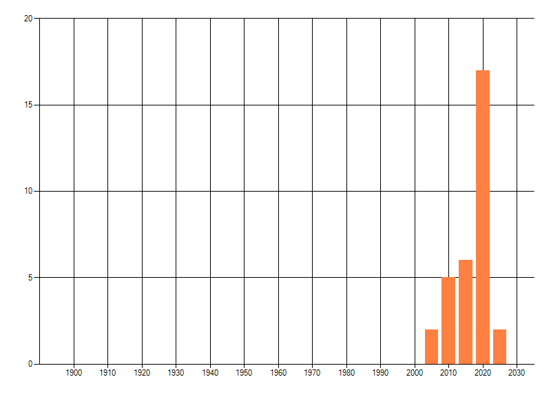 Het aantal atlasblokken (5x5 km) waarin de soort is gemeld binnen een periode van vijf jaar (vanaf 1980) of twintig jaar. Niet gecorrigeerd voor waarnemersinspanning en het aantal doorgegeven waarnemingen kan sterk variƫren per periode, dus een trend in verspreiding kan hier niet direct uit worden afgelezen. Het opgegeven jaartal is het eerste jaar van de periode. Bron: gevalideerde waarnemingen uit de NDFF.