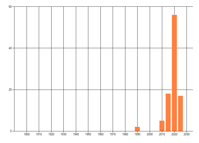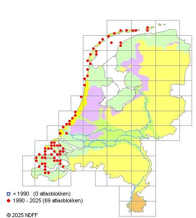 Het aantal atlasblokken (5x5 km) waarin de soort is gemeld binnen een periode van vijf jaar (vanaf 1980) of twintig jaar. Niet gecorrigeerd voor waarnemersinspanning en het aantal doorgegeven waarnemingen kan sterk variƫren per periode, dus een trend in verspreiding kan hier niet direct uit worden afgelezen. Het opgegeven jaartal is het eerste jaar van de periode. Bron: gevalideerde waarnemingen uit de NDFF.