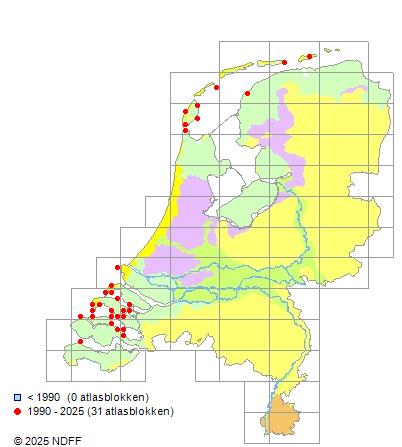 Het aantal atlasblokken (5x5 km) waarin de soort is gemeld binnen een periode van vijf jaar (vanaf 1980) of twintig jaar. Niet gecorrigeerd voor waarnemersinspanning en het aantal doorgegeven waarnemingen kan sterk variƫren per periode, dus een trend in verspreiding kan hier niet direct uit worden afgelezen. Het opgegeven jaartal is het eerste jaar van de periode. Bron: gevalideerde waarnemingen uit de NDFF.