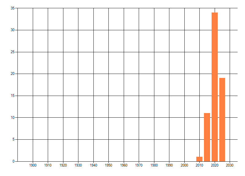 Het aantal atlasblokken (5x5 km) waarin de soort is gemeld binnen een periode van vijf jaar (vanaf 1980) of twintig jaar. Niet gecorrigeerd voor waarnemersinspanning en het aantal doorgegeven waarnemingen kan sterk variƫren per periode, dus een trend in verspreiding kan hier niet direct uit worden afgelezen. Het opgegeven jaartal is het eerste jaar van de periode. Bron: gevalideerde waarnemingen uit de NDFF.