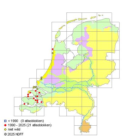Het aantal atlasblokken (5x5 km) waarin de soort is gemeld binnen een periode van vijf jaar (vanaf 1980) of twintig jaar. Niet gecorrigeerd voor waarnemersinspanning en het aantal doorgegeven waarnemingen kan sterk variëren per periode, dus een trend in verspreiding kan hier niet direct uit worden afgelezen. Het opgegeven jaartal is het eerste jaar van de periode. Bron: gevalideerde waarnemingen uit de NDFF.