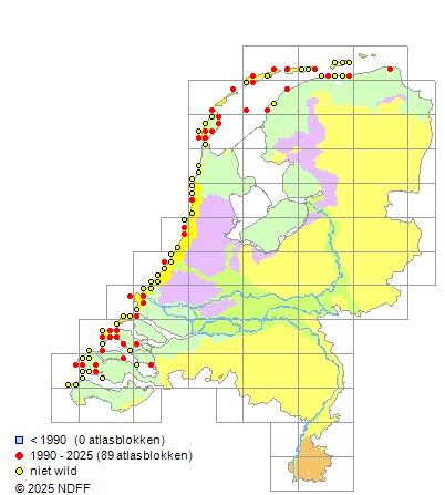 Het aantal atlasblokken (5x5 km) waarin de soort is gemeld binnen een periode van vijf jaar (vanaf 1980) of twintig jaar. Niet gecorrigeerd voor waarnemersinspanning en het aantal doorgegeven waarnemingen kan sterk variëren per periode, dus een trend in verspreiding kan hier niet direct uit worden afgelezen. Het opgegeven jaartal is het eerste jaar van de periode. Bron: gevalideerde waarnemingen uit de NDFF.