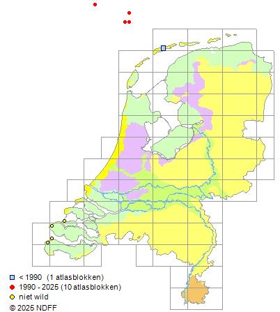 Het aantal atlasblokken (5x5 km) waarin de soort is gemeld binnen een periode van vijf jaar (vanaf 1980) of twintig jaar. Niet gecorrigeerd voor waarnemersinspanning en het aantal doorgegeven waarnemingen kan sterk variëren per periode, dus een trend in verspreiding kan hier niet direct uit worden afgelezen. Het opgegeven jaartal is het eerste jaar van de periode. Bron: gevalideerde waarnemingen uit de NDFF.