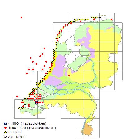 Het aantal atlasblokken (5x5 km) waarin de soort is gemeld binnen een periode van vijf jaar (vanaf 1980) of twintig jaar. Niet gecorrigeerd voor waarnemersinspanning en het aantal doorgegeven waarnemingen kan sterk variëren per periode, dus een trend in verspreiding kan hier niet direct uit worden afgelezen. Het opgegeven jaartal is het eerste jaar van de periode. Bron: gevalideerde waarnemingen uit de NDFF.