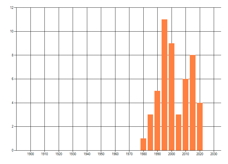 Het aantal atlasblokken (5x5 km) waarin de soort is gemeld binnen een periode van vijf jaar (vanaf 1980) of twintig jaar. Niet gecorrigeerd voor waarnemersinspanning en het aantal doorgegeven waarnemingen kan sterk variëren per periode, dus een trend in verspreiding kan hier niet direct uit worden afgelezen. Het opgegeven jaartal is het eerste jaar van de periode. Bron: gevalideerde waarnemingen uit de NDFF.