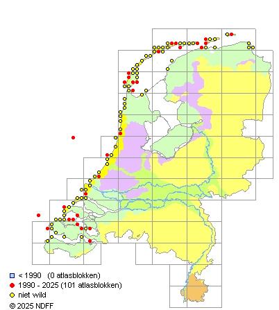 Het aantal atlasblokken (5x5 km) waarin de soort is gemeld binnen een periode van vijf jaar (vanaf 1980) of twintig jaar. Niet gecorrigeerd voor waarnemersinspanning en het aantal doorgegeven waarnemingen kan sterk variëren per periode, dus een trend in verspreiding kan hier niet direct uit worden afgelezen. Het opgegeven jaartal is het eerste jaar van de periode. Bron: gevalideerde waarnemingen uit de NDFF.
