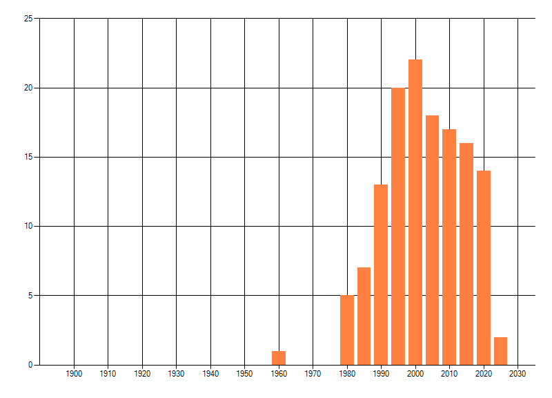 Het aantal atlasblokken (5x5 km) waarin de soort is gemeld binnen een periode van vijf jaar (vanaf 1980) of twintig jaar. Niet gecorrigeerd voor waarnemersinspanning en het aantal doorgegeven waarnemingen kan sterk variëren per periode, dus een trend in verspreiding kan hier niet direct uit worden afgelezen. Het opgegeven jaartal is het eerste jaar van de periode. Bron: gevalideerde waarnemingen uit de NDFF.