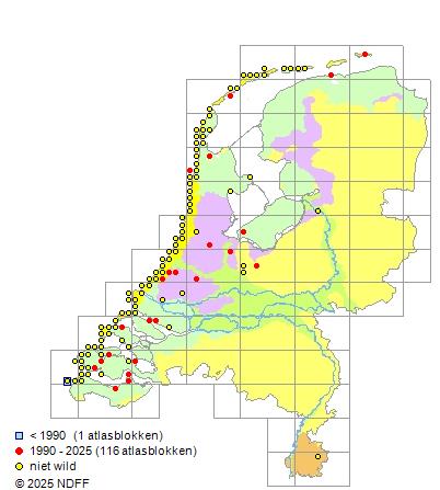 Het aantal atlasblokken (5x5 km) waarin de soort is gemeld binnen een periode van vijf jaar (vanaf 1980) of twintig jaar. Niet gecorrigeerd voor waarnemersinspanning en het aantal doorgegeven waarnemingen kan sterk variëren per periode, dus een trend in verspreiding kan hier niet direct uit worden afgelezen. Het opgegeven jaartal is het eerste jaar van de periode. Bron: gevalideerde waarnemingen uit de NDFF.