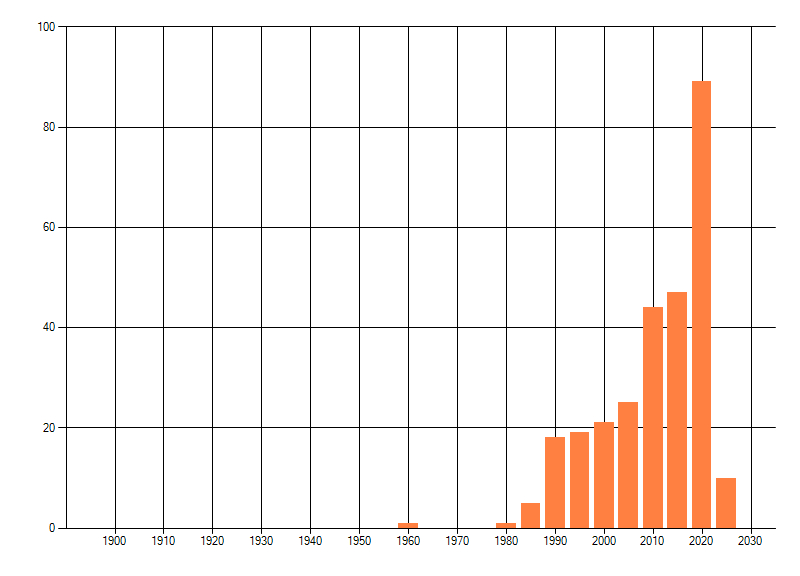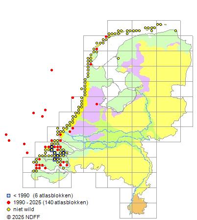 Het aantal atlasblokken (5x5 km) waarin de soort is gemeld binnen een periode van vijf jaar (vanaf 1980) of twintig jaar. Niet gecorrigeerd voor waarnemersinspanning en het aantal doorgegeven waarnemingen kan sterk variëren per periode, dus een trend in verspreiding kan hier niet direct uit worden afgelezen. Het opgegeven jaartal is het eerste jaar van de periode. Bron: gevalideerde waarnemingen uit de NDFF.