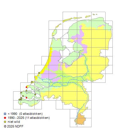 Het aantal atlasblokken (5x5 km) waarin de soort is gemeld binnen een periode van vijf jaar (vanaf 1980) of twintig jaar. Niet gecorrigeerd voor waarnemersinspanning en het aantal doorgegeven waarnemingen kan sterk variëren per periode, dus een trend in verspreiding kan hier niet direct uit worden afgelezen. Het opgegeven jaartal is het eerste jaar van de periode. Bron: gevalideerde waarnemingen uit de NDFF.