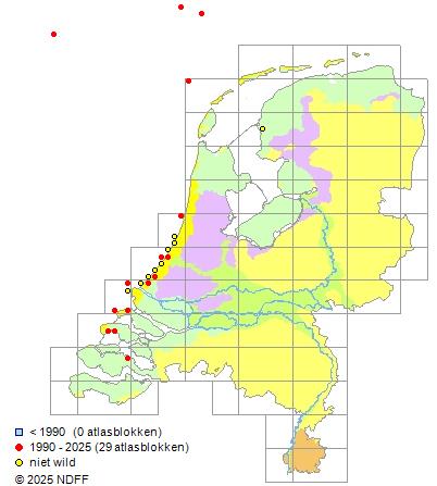 Het aantal atlasblokken (5x5 km) waarin de soort is gemeld binnen een periode van vijf jaar (vanaf 1980) of twintig jaar. Niet gecorrigeerd voor waarnemersinspanning en het aantal doorgegeven waarnemingen kan sterk variëren per periode, dus een trend in verspreiding kan hier niet direct uit worden afgelezen. Het opgegeven jaartal is het eerste jaar van de periode. Bron: gevalideerde waarnemingen uit de NDFF.