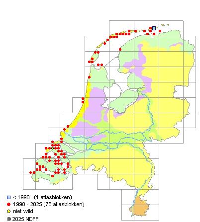 Het aantal atlasblokken (5x5 km) waarin de soort is gemeld binnen een periode van vijf jaar (vanaf 1980) of twintig jaar. Niet gecorrigeerd voor waarnemersinspanning en het aantal doorgegeven waarnemingen kan sterk variëren per periode, dus een trend in verspreiding kan hier niet direct uit worden afgelezen. Het opgegeven jaartal is het eerste jaar van de periode. Bron: gevalideerde waarnemingen uit de NDFF.