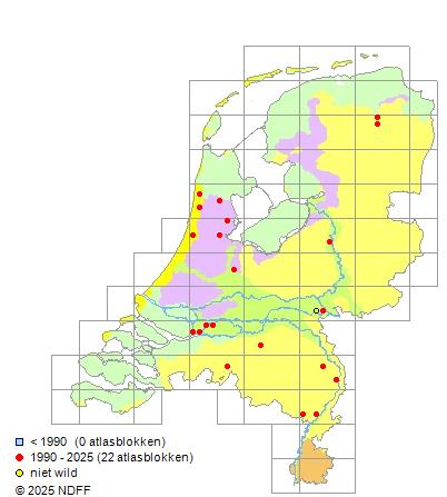 Het aantal atlasblokken (5x5 km) waarin de soort is gemeld binnen een periode van vijf jaar (vanaf 1980) of twintig jaar. Niet gecorrigeerd voor waarnemersinspanning en het aantal doorgegeven waarnemingen kan sterk variëren per periode, dus een trend in verspreiding kan hier niet direct uit worden afgelezen. Het opgegeven jaartal is het eerste jaar van de periode. Bron: gevalideerde waarnemingen uit de NDFF.