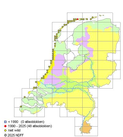 Het aantal atlasblokken (5x5 km) waarin de soort is gemeld binnen een periode van vijf jaar (vanaf 1980) of twintig jaar. Niet gecorrigeerd voor waarnemersinspanning en het aantal doorgegeven waarnemingen kan sterk variëren per periode, dus een trend in verspreiding kan hier niet direct uit worden afgelezen. Het opgegeven jaartal is het eerste jaar van de periode. Bron: gevalideerde waarnemingen uit de NDFF.