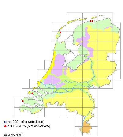 Het aantal atlasblokken (5x5 km) waarin de soort is gemeld binnen een periode van vijf jaar (vanaf 1980) of twintig jaar. Niet gecorrigeerd voor waarnemersinspanning en het aantal doorgegeven waarnemingen kan sterk variëren per periode, dus een trend in verspreiding kan hier niet direct uit worden afgelezen. Het opgegeven jaartal is het eerste jaar van de periode. Bron: gevalideerde waarnemingen uit de NDFF.