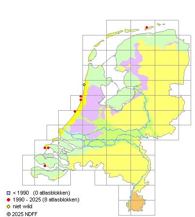 Het aantal atlasblokken (5x5 km) waarin de soort is gemeld binnen een periode van vijf jaar (vanaf 1980) of twintig jaar. Niet gecorrigeerd voor waarnemersinspanning en het aantal doorgegeven waarnemingen kan sterk variëren per periode, dus een trend in verspreiding kan hier niet direct uit worden afgelezen. Het opgegeven jaartal is het eerste jaar van de periode. Bron: gevalideerde waarnemingen uit de NDFF.
