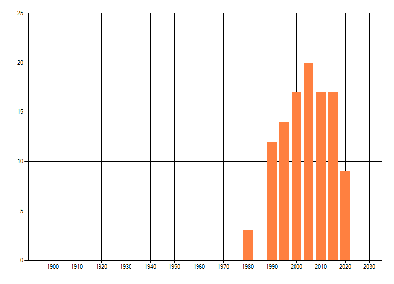 Het aantal atlasblokken (5x5 km) waarin de soort is gemeld binnen een periode van vijf jaar (vanaf 1980) of twintig jaar. Niet gecorrigeerd voor waarnemersinspanning en het aantal doorgegeven waarnemingen kan sterk variëren per periode, dus een trend in verspreiding kan hier niet direct uit worden afgelezen. Het opgegeven jaartal is het eerste jaar van de periode. Bron: gevalideerde waarnemingen uit de NDFF.