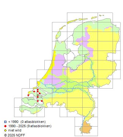 Het aantal atlasblokken (5x5 km) waarin de soort is gemeld binnen een periode van vijf jaar (vanaf 1980) of twintig jaar. Niet gecorrigeerd voor waarnemersinspanning en het aantal doorgegeven waarnemingen kan sterk variëren per periode, dus een trend in verspreiding kan hier niet direct uit worden afgelezen. Het opgegeven jaartal is het eerste jaar van de periode. Bron: gevalideerde waarnemingen uit de NDFF.