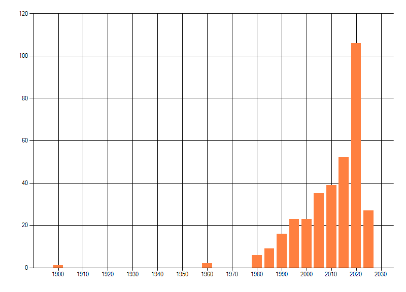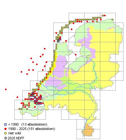 Het aantal atlasblokken (5x5 km) waarin de soort is gemeld binnen een periode van vijf jaar (vanaf 1980) of twintig jaar. Niet gecorrigeerd voor waarnemersinspanning en het aantal doorgegeven waarnemingen kan sterk variëren per periode, dus een trend in verspreiding kan hier niet direct uit worden afgelezen. Het opgegeven jaartal is het eerste jaar van de periode. Bron: gevalideerde waarnemingen uit de NDFF.
