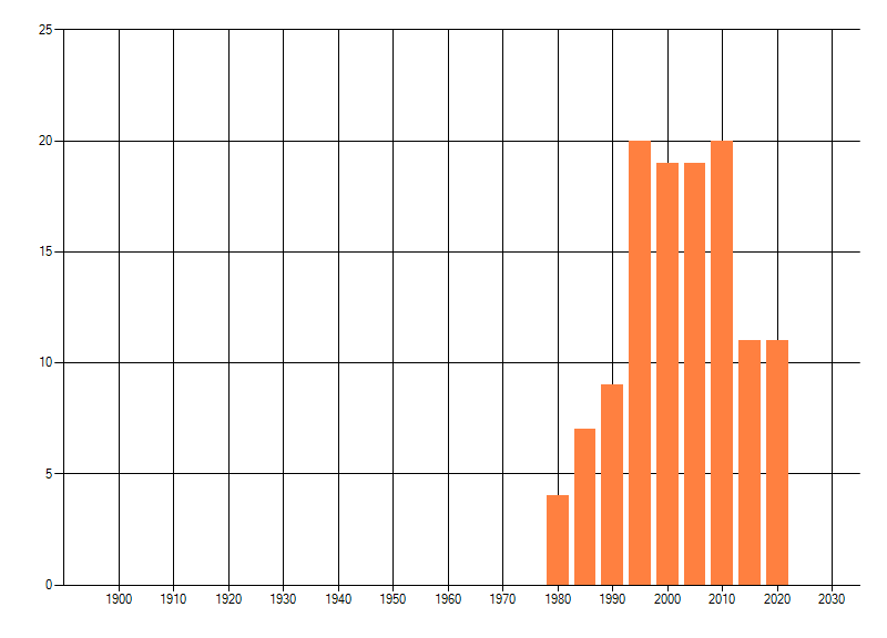 Het aantal atlasblokken (5x5 km) waarin de soort is gemeld binnen een periode van vijf jaar (vanaf 1980) of twintig jaar. Niet gecorrigeerd voor waarnemersinspanning en het aantal doorgegeven waarnemingen kan sterk variëren per periode, dus een trend in verspreiding kan hier niet direct uit worden afgelezen. Het opgegeven jaartal is het eerste jaar van de periode. Bron: gevalideerde waarnemingen uit de NDFF.