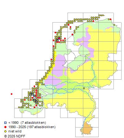 Het aantal atlasblokken (5x5 km) waarin de soort is gemeld binnen een periode van vijf jaar (vanaf 1980) of twintig jaar. Niet gecorrigeerd voor waarnemersinspanning en het aantal doorgegeven waarnemingen kan sterk variëren per periode, dus een trend in verspreiding kan hier niet direct uit worden afgelezen. Het opgegeven jaartal is het eerste jaar van de periode. Bron: gevalideerde waarnemingen uit de NDFF.