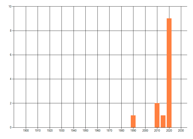 Het aantal atlasblokken (5x5 km) waarin de soort is gemeld binnen een periode van vijf jaar (vanaf 1980) of twintig jaar. Niet gecorrigeerd voor waarnemersinspanning en het aantal doorgegeven waarnemingen kan sterk variëren per periode, dus een trend in verspreiding kan hier niet direct uit worden afgelezen. Het opgegeven jaartal is het eerste jaar van de periode. Bron: gevalideerde waarnemingen uit de NDFF.