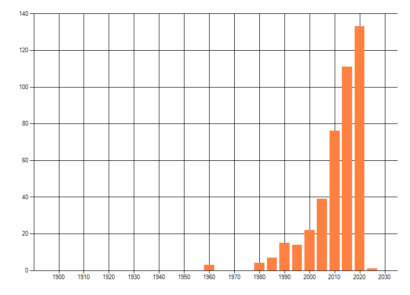 Het aantal atlasblokken (5x5 km) waarin de soort is gemeld binnen een periode van vijf jaar (vanaf 1980) of twintig jaar. Niet gecorrigeerd voor waarnemersinspanning en het aantal doorgegeven waarnemingen kan sterk variëren per periode, dus een trend in verspreiding kan hier niet direct uit worden afgelezen. Het opgegeven jaartal is het eerste jaar van de periode. Bron: gevalideerde waarnemingen uit de NDFF.