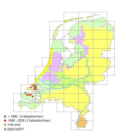 Het aantal atlasblokken (5x5 km) waarin de soort is gemeld binnen een periode van vijf jaar (vanaf 1980) of twintig jaar. Niet gecorrigeerd voor waarnemersinspanning en het aantal doorgegeven waarnemingen kan sterk variëren per periode, dus een trend in verspreiding kan hier niet direct uit worden afgelezen. Het opgegeven jaartal is het eerste jaar van de periode. Bron: gevalideerde waarnemingen uit de NDFF.