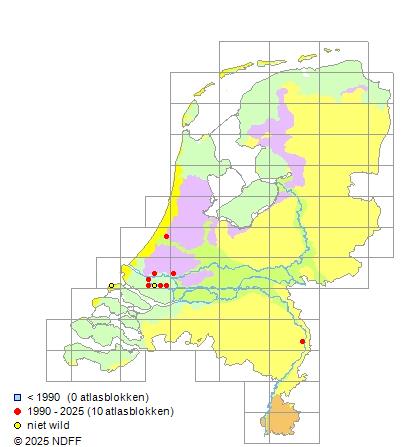 Het aantal atlasblokken (5x5 km) waarin de soort is gemeld binnen een periode van vijf jaar (vanaf 1980) of twintig jaar. Niet gecorrigeerd voor waarnemersinspanning en het aantal doorgegeven waarnemingen kan sterk variëren per periode, dus een trend in verspreiding kan hier niet direct uit worden afgelezen. Het opgegeven jaartal is het eerste jaar van de periode. Bron: gevalideerde waarnemingen uit de NDFF.
