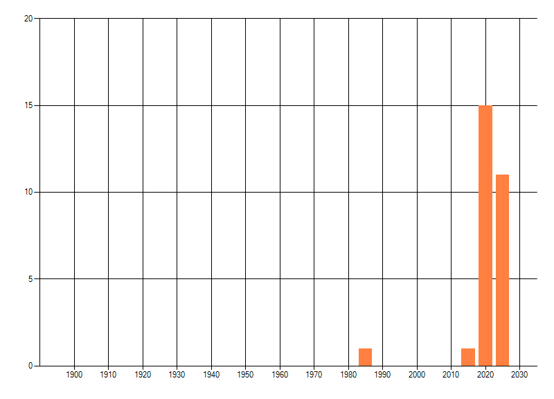 Het aantal atlasblokken (5x5 km) waarin de soort is gemeld binnen een periode van vijf jaar (vanaf 1980) of twintig jaar. Niet gecorrigeerd voor waarnemersinspanning en het aantal doorgegeven waarnemingen kan sterk variëren per periode, dus een trend in verspreiding kan hier niet direct uit worden afgelezen. Het opgegeven jaartal is het eerste jaar van de periode. Bron: gevalideerde waarnemingen uit de NDFF.