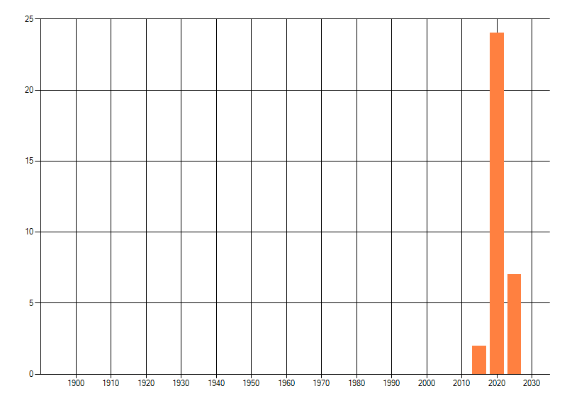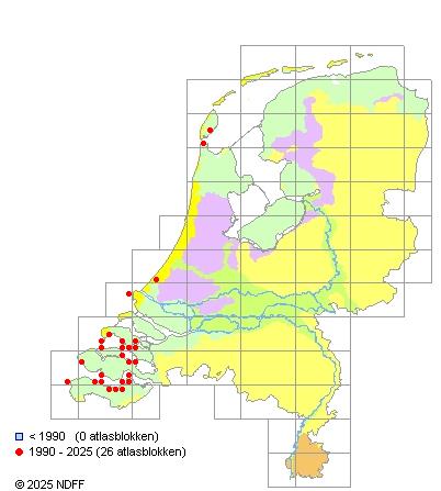 Het aantal atlasblokken (5x5 km) waarin de soort is gemeld binnen een periode van vijf jaar (vanaf 1980) of twintig jaar. Niet gecorrigeerd voor waarnemersinspanning en het aantal doorgegeven waarnemingen kan sterk variëren per periode, dus een trend in verspreiding kan hier niet direct uit worden afgelezen. Het opgegeven jaartal is het eerste jaar van de periode. Bron: gevalideerde waarnemingen uit de NDFF.
