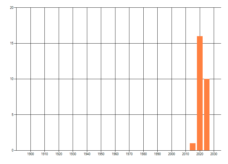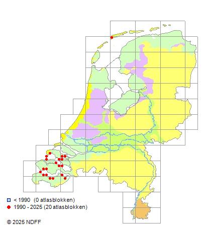 Het aantal atlasblokken (5x5 km) waarin de soort is gemeld binnen een periode van vijf jaar (vanaf 1980) of twintig jaar. Niet gecorrigeerd voor waarnemersinspanning en het aantal doorgegeven waarnemingen kan sterk variëren per periode, dus een trend in verspreiding kan hier niet direct uit worden afgelezen. Het opgegeven jaartal is het eerste jaar van de periode. Bron: gevalideerde waarnemingen uit de NDFF.