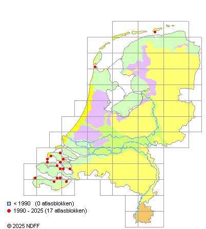 Het aantal atlasblokken (5x5 km) waarin de soort is gemeld binnen een periode van vijf jaar (vanaf 1980) of twintig jaar. Niet gecorrigeerd voor waarnemersinspanning en het aantal doorgegeven waarnemingen kan sterk variëren per periode, dus een trend in verspreiding kan hier niet direct uit worden afgelezen. Het opgegeven jaartal is het eerste jaar van de periode. Bron: gevalideerde waarnemingen uit de NDFF.