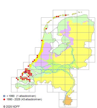 Het aantal atlasblokken (5x5 km) waarin de soort is gemeld binnen een periode van vijf jaar (vanaf 1980) of twintig jaar. Niet gecorrigeerd voor waarnemersinspanning en het aantal doorgegeven waarnemingen kan sterk variëren per periode, dus een trend in verspreiding kan hier niet direct uit worden afgelezen. Het opgegeven jaartal is het eerste jaar van de periode. Bron: gevalideerde waarnemingen uit de NDFF.