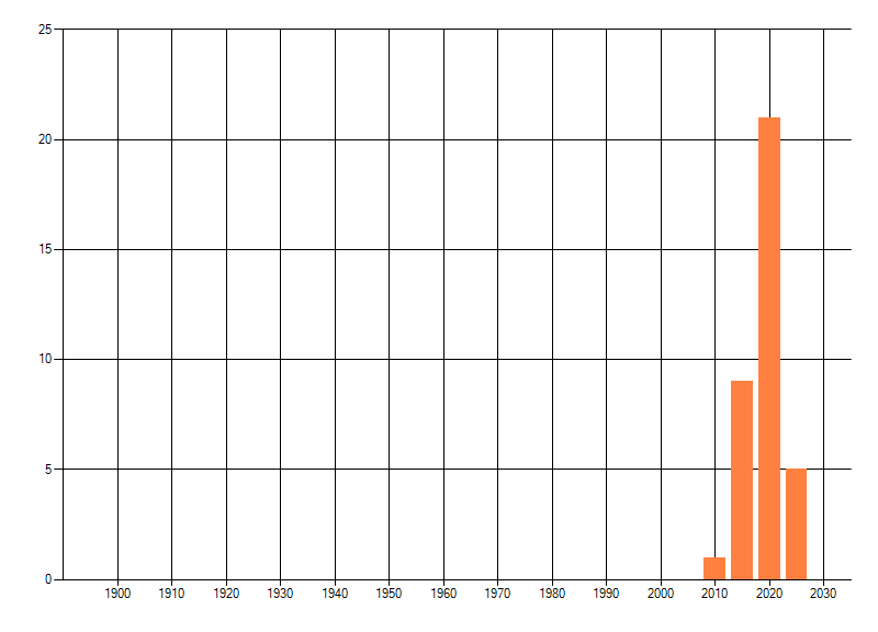 Het aantal atlasblokken (5x5 km) waarin de soort is gemeld binnen een periode van vijf jaar (vanaf 1980) of twintig jaar. Niet gecorrigeerd voor waarnemersinspanning en het aantal doorgegeven waarnemingen kan sterk variëren per periode, dus een trend in verspreiding kan hier niet direct uit worden afgelezen. Het opgegeven jaartal is het eerste jaar van de periode. Bron: gevalideerde waarnemingen uit de NDFF.