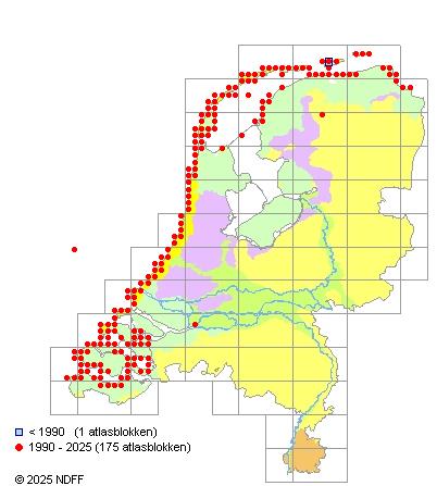 Het aantal atlasblokken (5x5 km) waarin de soort is gemeld binnen een periode van vijf jaar (vanaf 1980) of twintig jaar. Niet gecorrigeerd voor waarnemersinspanning en het aantal doorgegeven waarnemingen kan sterk variëren per periode, dus een trend in verspreiding kan hier niet direct uit worden afgelezen. Het opgegeven jaartal is het eerste jaar van de periode. Bron: gevalideerde waarnemingen uit de NDFF.