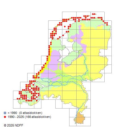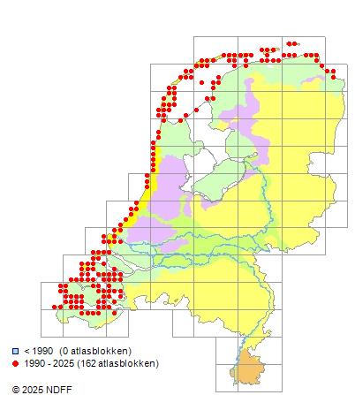 Het aantal atlasblokken (5x5 km) waarin de soort is gemeld binnen een periode van vijf jaar (vanaf 1980) of twintig jaar. Niet gecorrigeerd voor waarnemersinspanning en het aantal doorgegeven waarnemingen kan sterk variëren per periode, dus een trend in verspreiding kan hier niet direct uit worden afgelezen. Het opgegeven jaartal is het eerste jaar van de periode. Bron: gevalideerde waarnemingen uit de NDFF.
