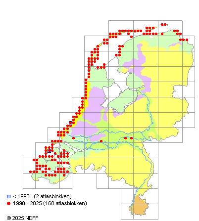 Het aantal atlasblokken (5x5 km) waarin de soort is gemeld binnen een periode van vijf jaar (vanaf 1980) of twintig jaar. Niet gecorrigeerd voor waarnemersinspanning en het aantal doorgegeven waarnemingen kan sterk variëren per periode, dus een trend in verspreiding kan hier niet direct uit worden afgelezen. Het opgegeven jaartal is het eerste jaar van de periode. Bron: gevalideerde waarnemingen uit de NDFF.