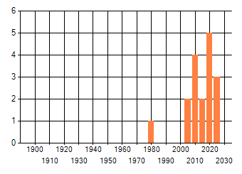 Het aantal atlasblokken (5x5 km) waarin de soort is gemeld binnen een periode van vijf jaar (vanaf 1980) of twintig jaar. Niet gecorrigeerd voor waarnemersinspanning en het aantal doorgegeven waarnemingen kan sterk variëren per periode, dus een trend in verspreiding kan hier niet direct uit worden afgelezen. Het opgegeven jaartal is het eerste jaar van de periode. Bron: gevalideerde waarnemingen uit de NDFF.