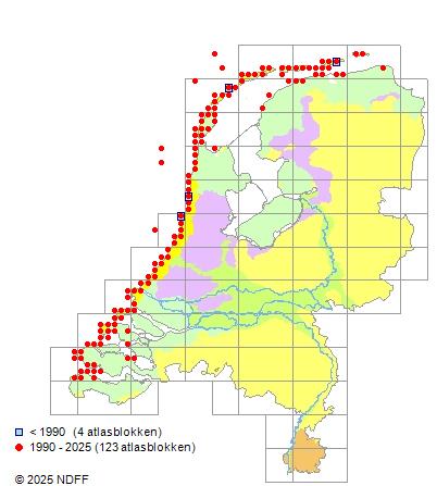 Het aantal atlasblokken (5x5 km) waarin de soort is gemeld binnen een periode van vijf jaar (vanaf 1980) of twintig jaar. Niet gecorrigeerd voor waarnemersinspanning en het aantal doorgegeven waarnemingen kan sterk variëren per periode, dus een trend in verspreiding kan hier niet direct uit worden afgelezen. Het opgegeven jaartal is het eerste jaar van de periode. Bron: gevalideerde waarnemingen uit de NDFF.