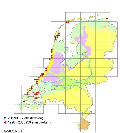 Het aantal atlasblokken (5x5 km) waarin de soort is gemeld binnen een periode van vijf jaar (vanaf 1980) of twintig jaar. Niet gecorrigeerd voor waarnemersinspanning en het aantal doorgegeven waarnemingen kan sterk variëren per periode, dus een trend in verspreiding kan hier niet direct uit worden afgelezen. Het opgegeven jaartal is het eerste jaar van de periode. Bron: gevalideerde waarnemingen uit de NDFF.